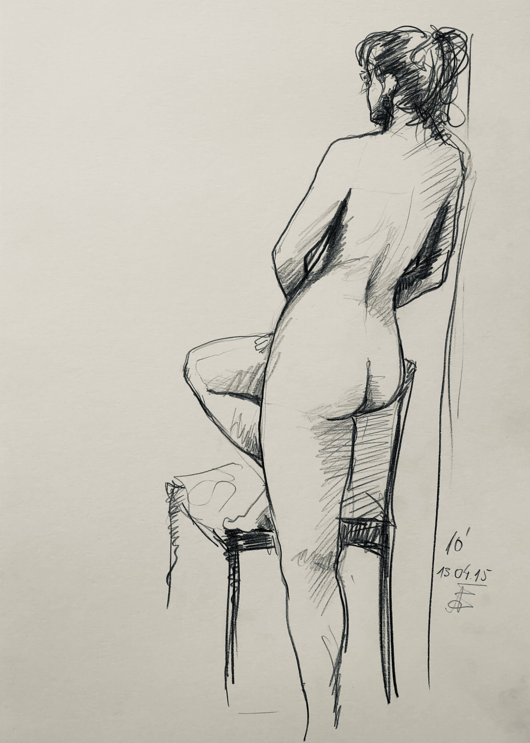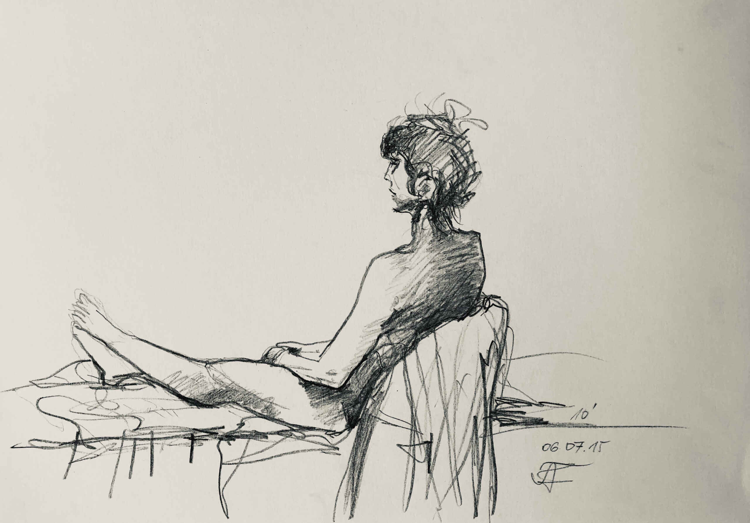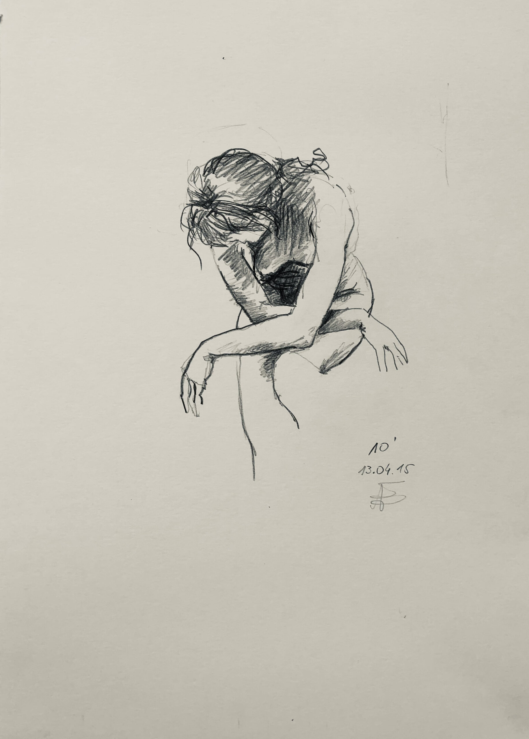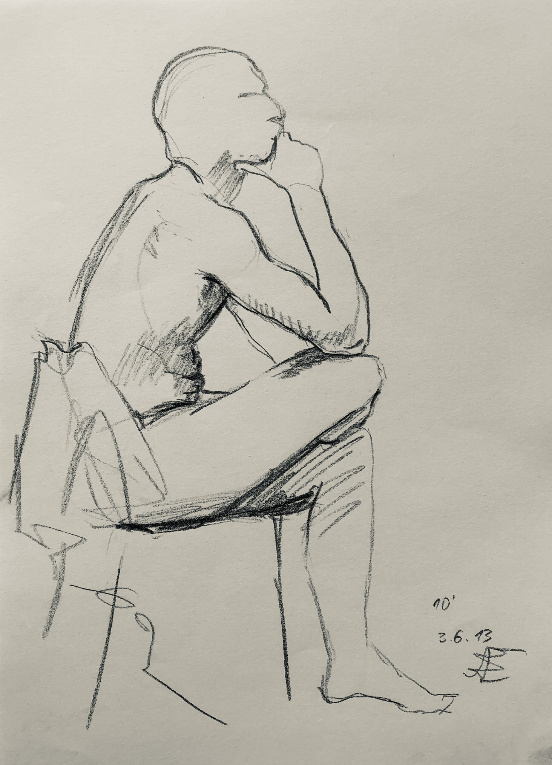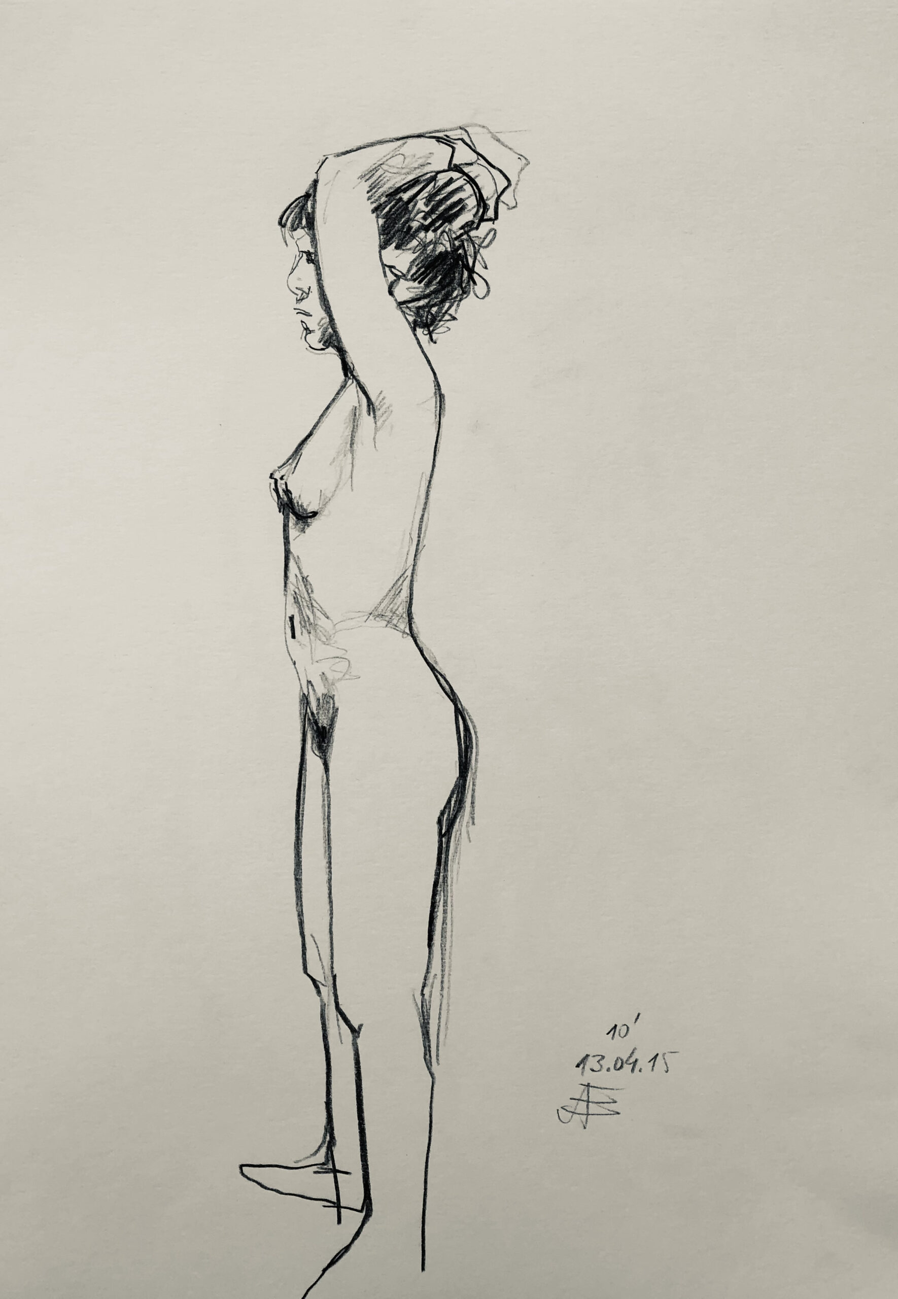 Oft sind es Schnellzeichnungen z.B. 10′ Minuten oder 15′ Minuten. Die Dauer des Zeichnens (10′) steht neben der Initialen.