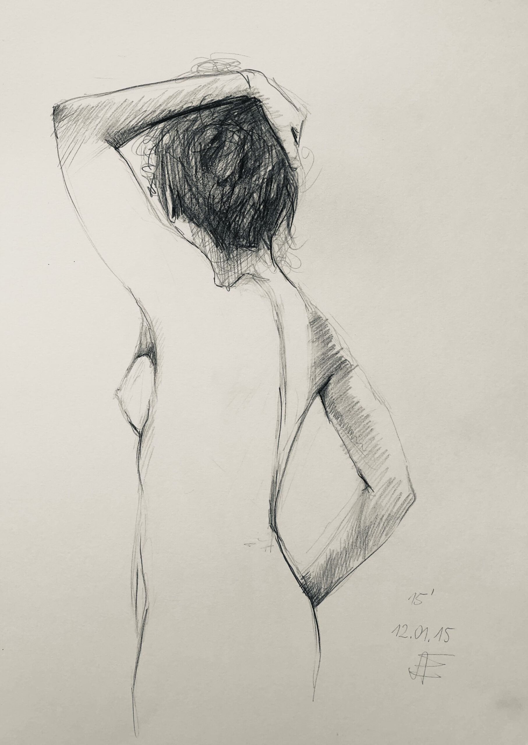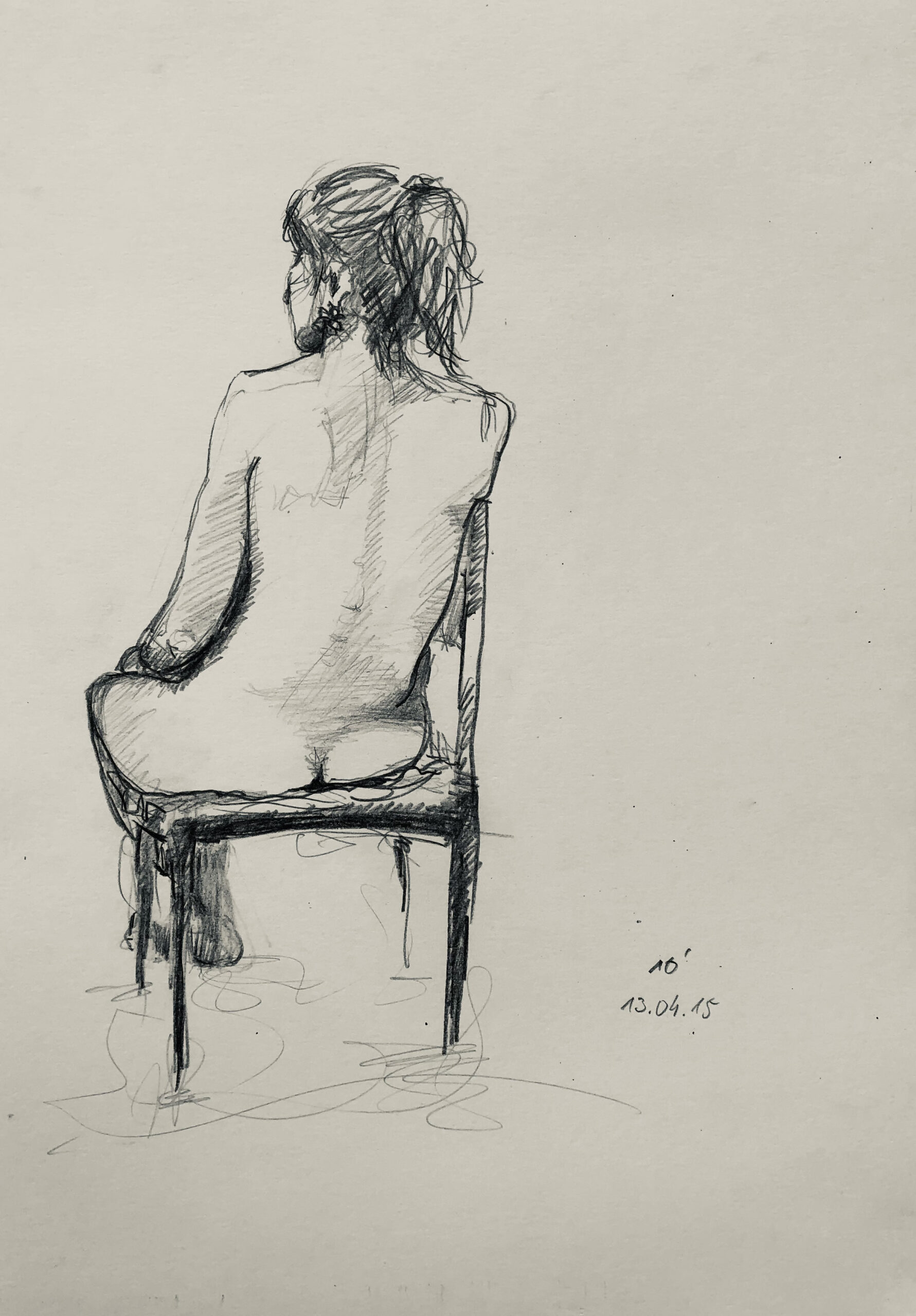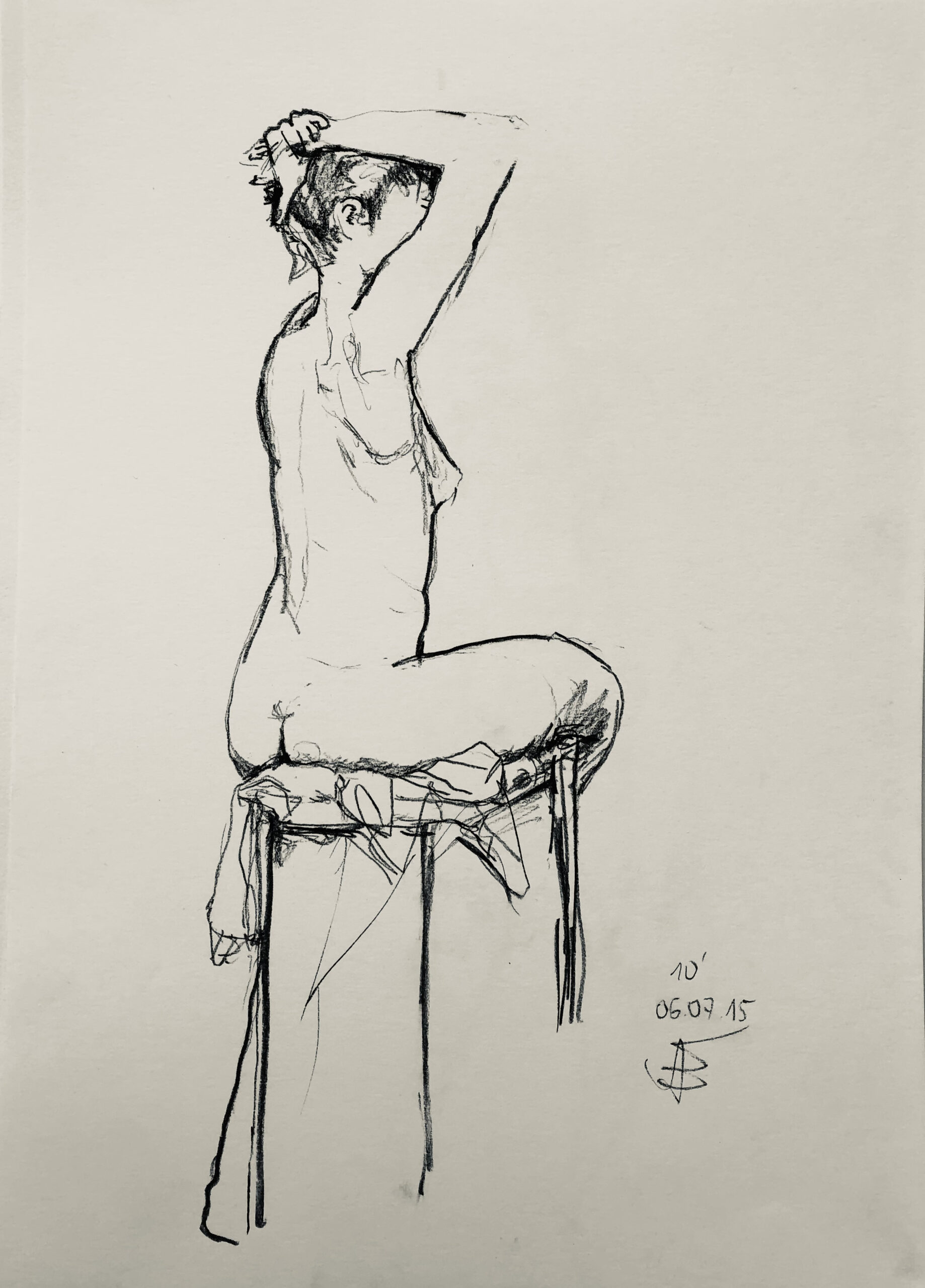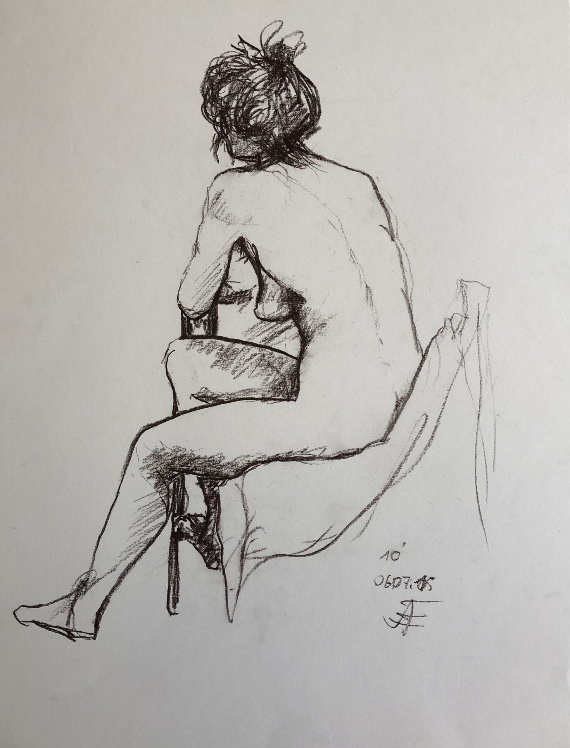 Oft sind es Schnellzeichnungen z.B. 10′ Minuten oder 15′ Minuten. Die Dauer des Zeichnens (10′) steht neben der Initialen.
