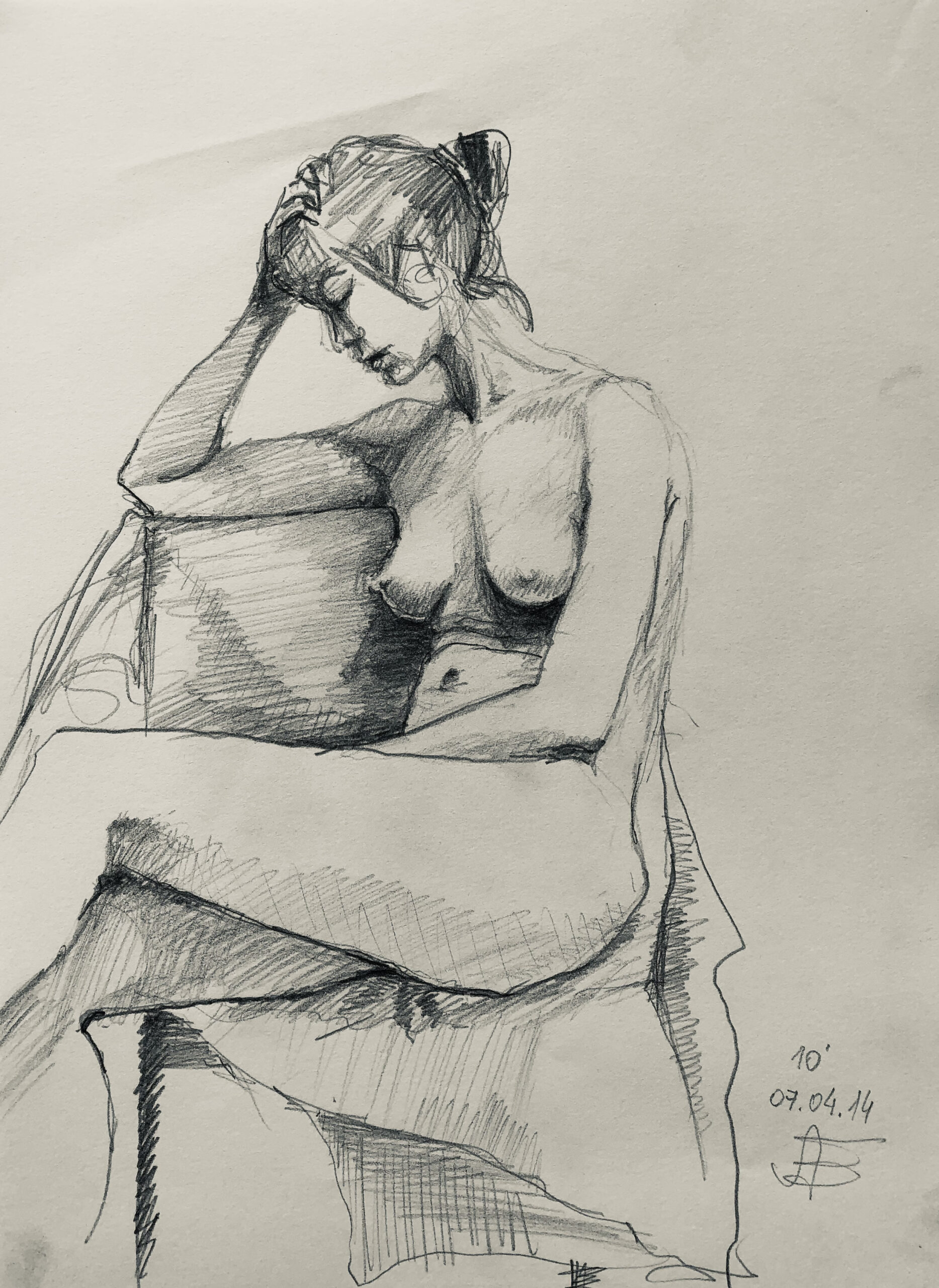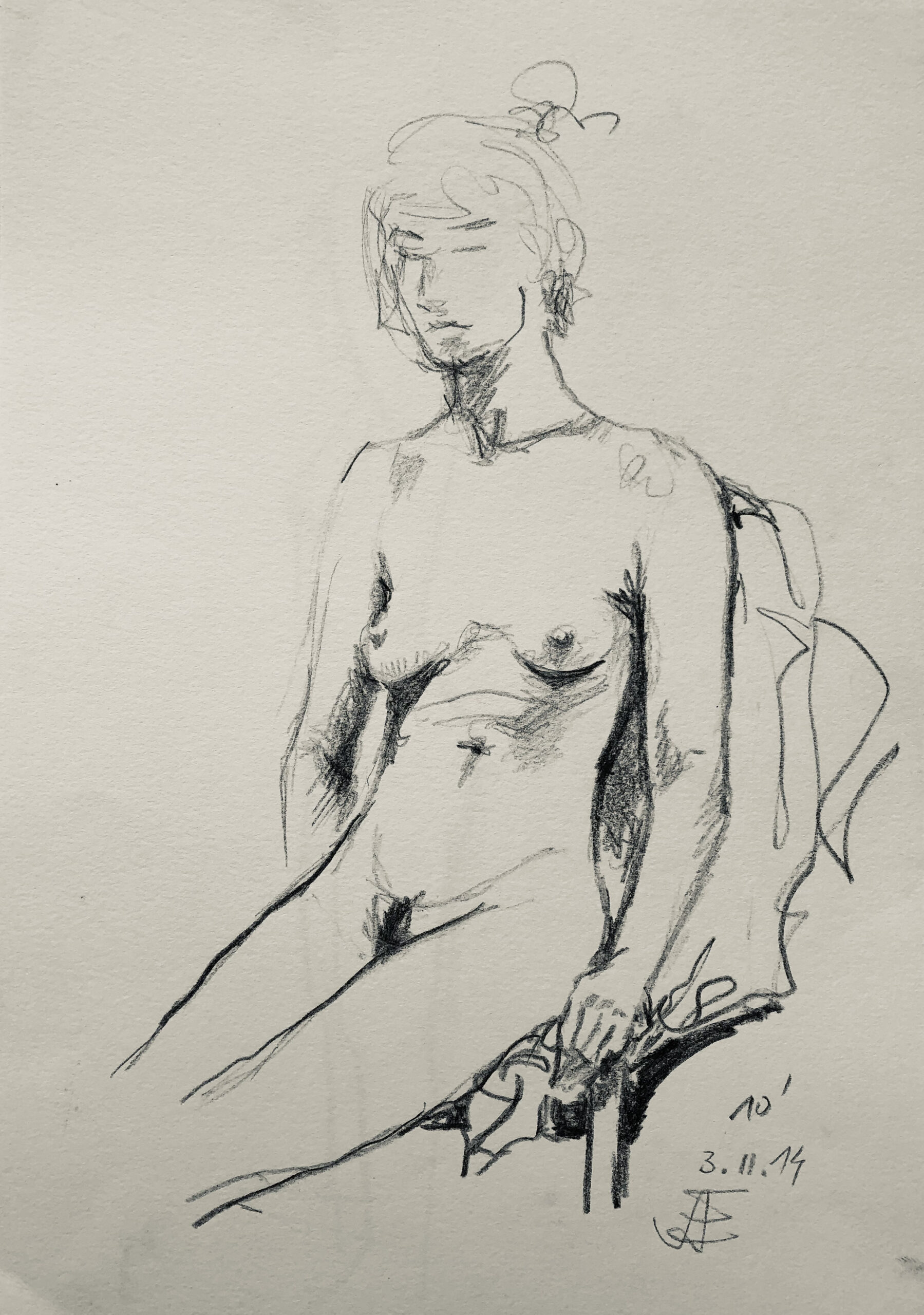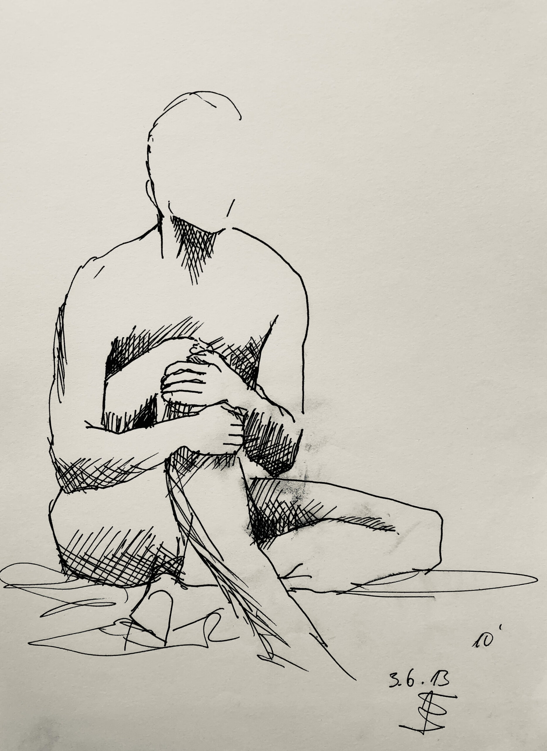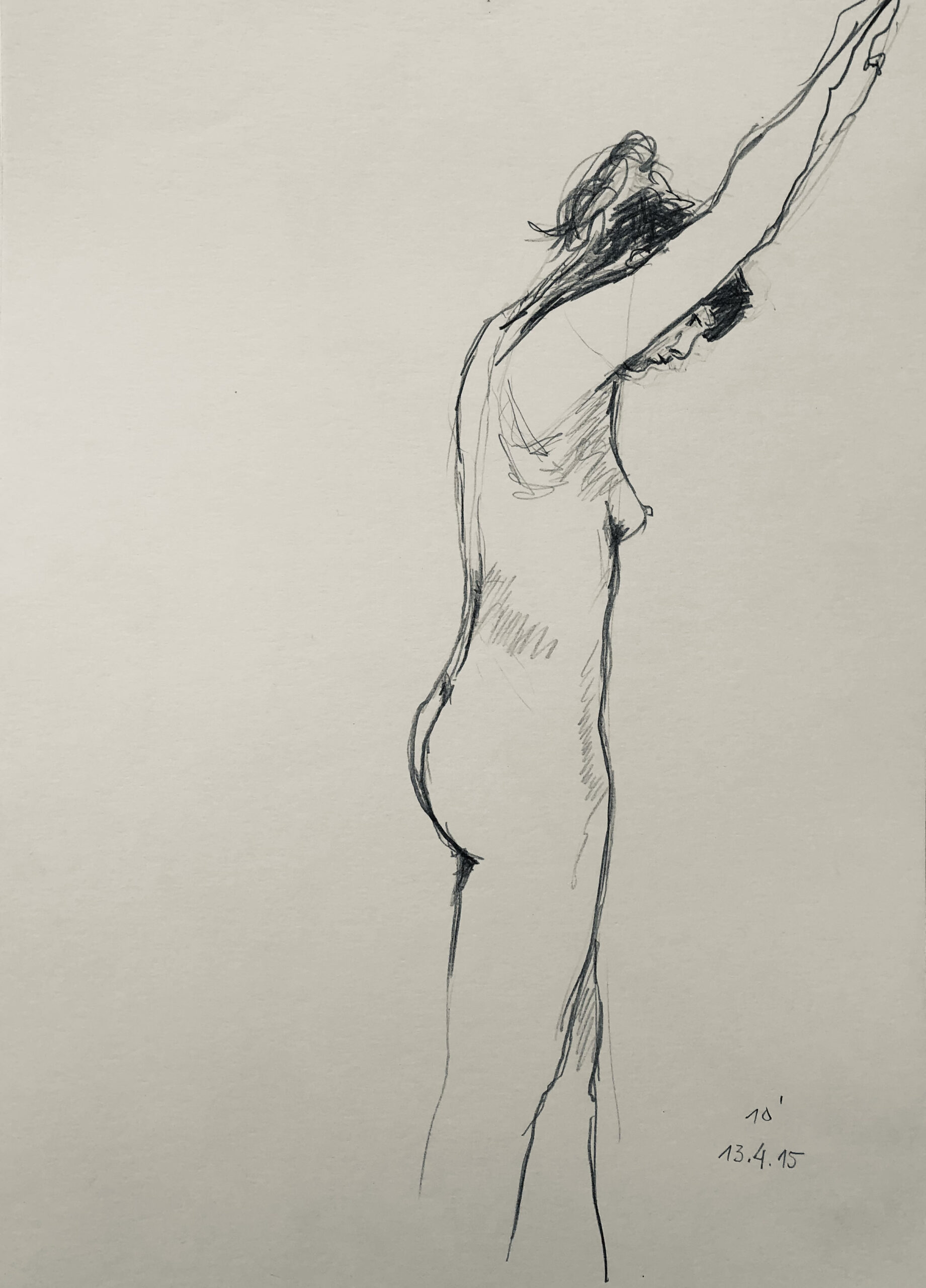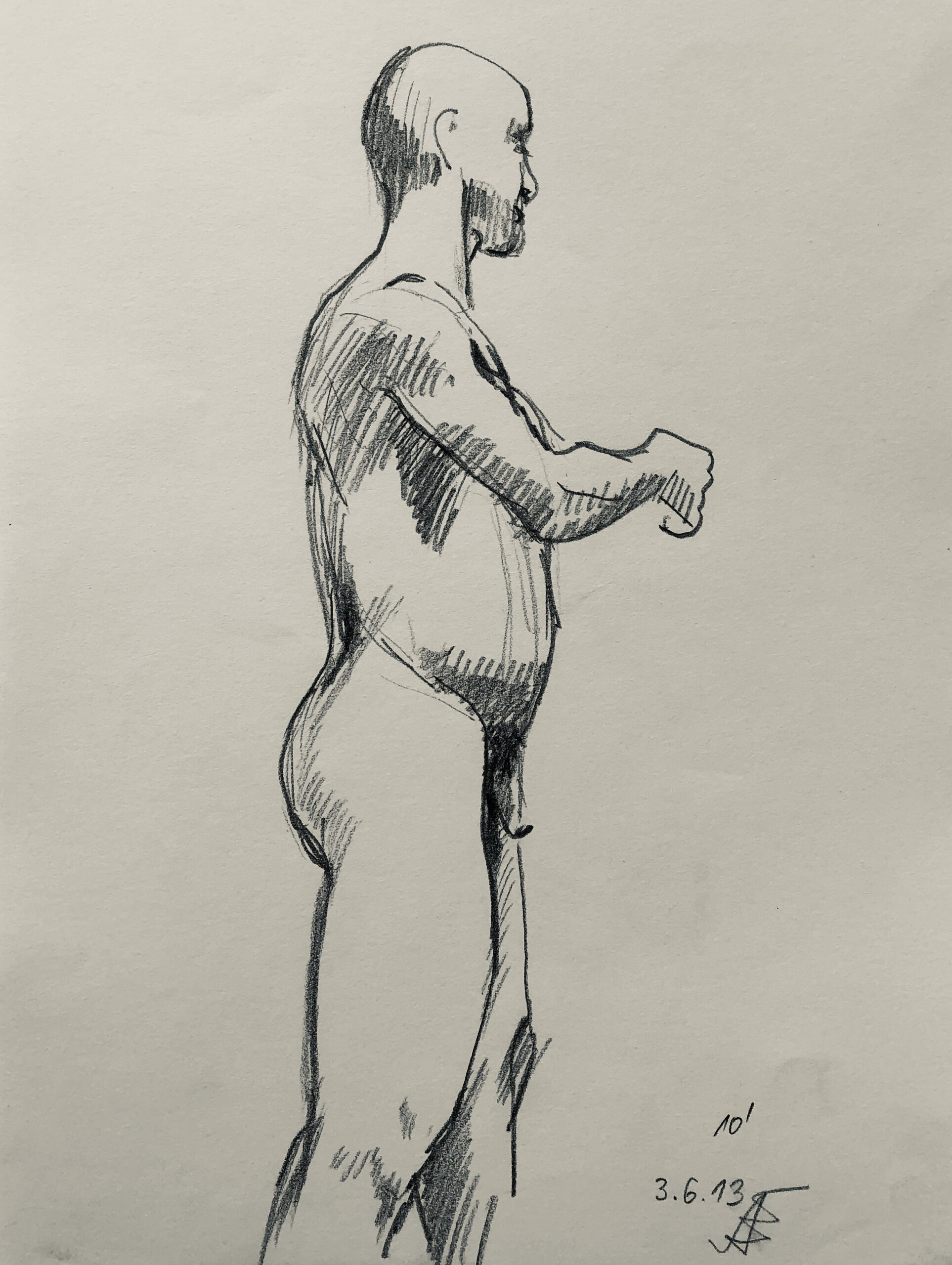 Oft sind es Schnellzeichnungen z.B. 10′ Minuten oder 15′ Minuten. Die Dauer des Zeichnens (10′) steht neben der Initialen.