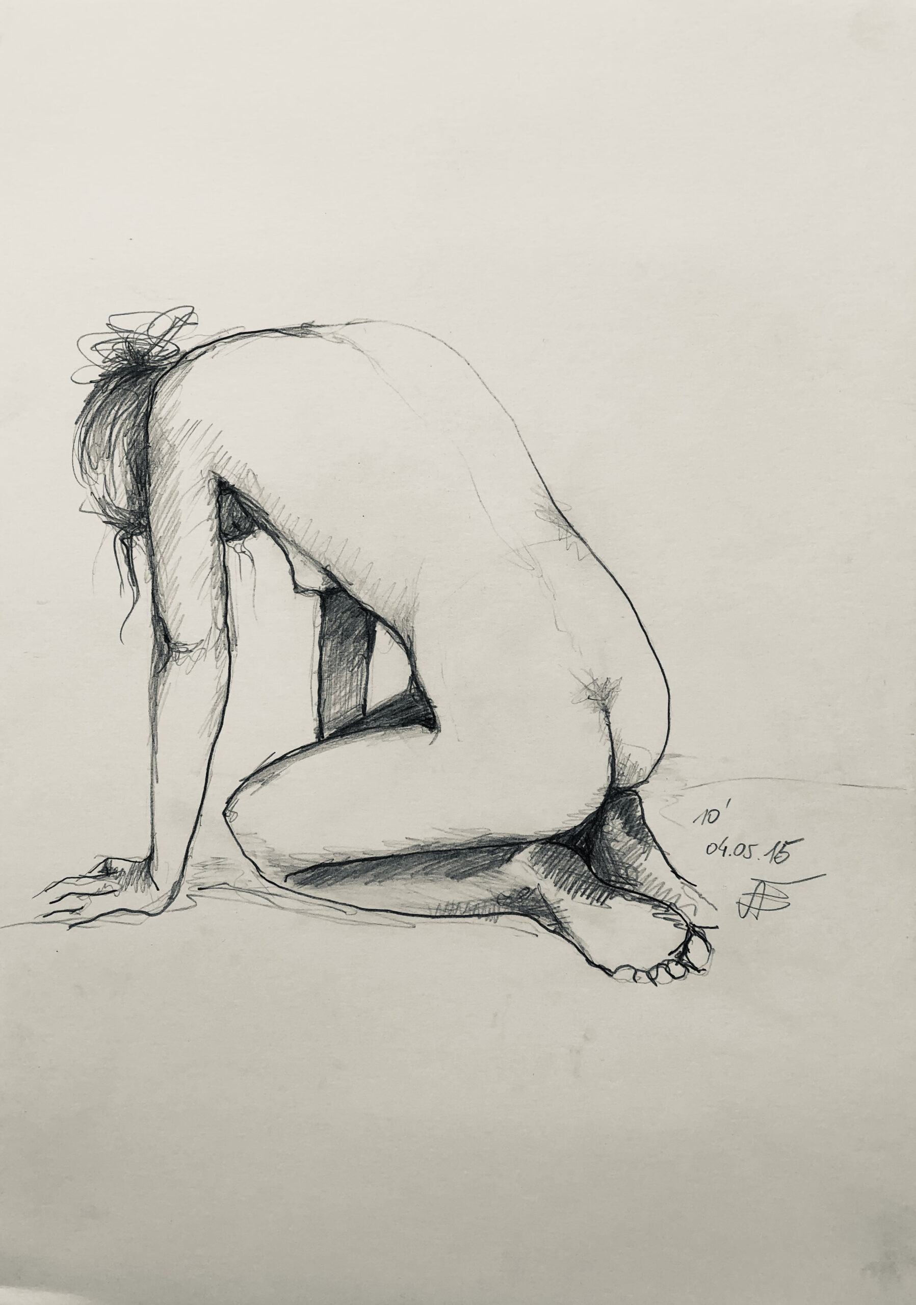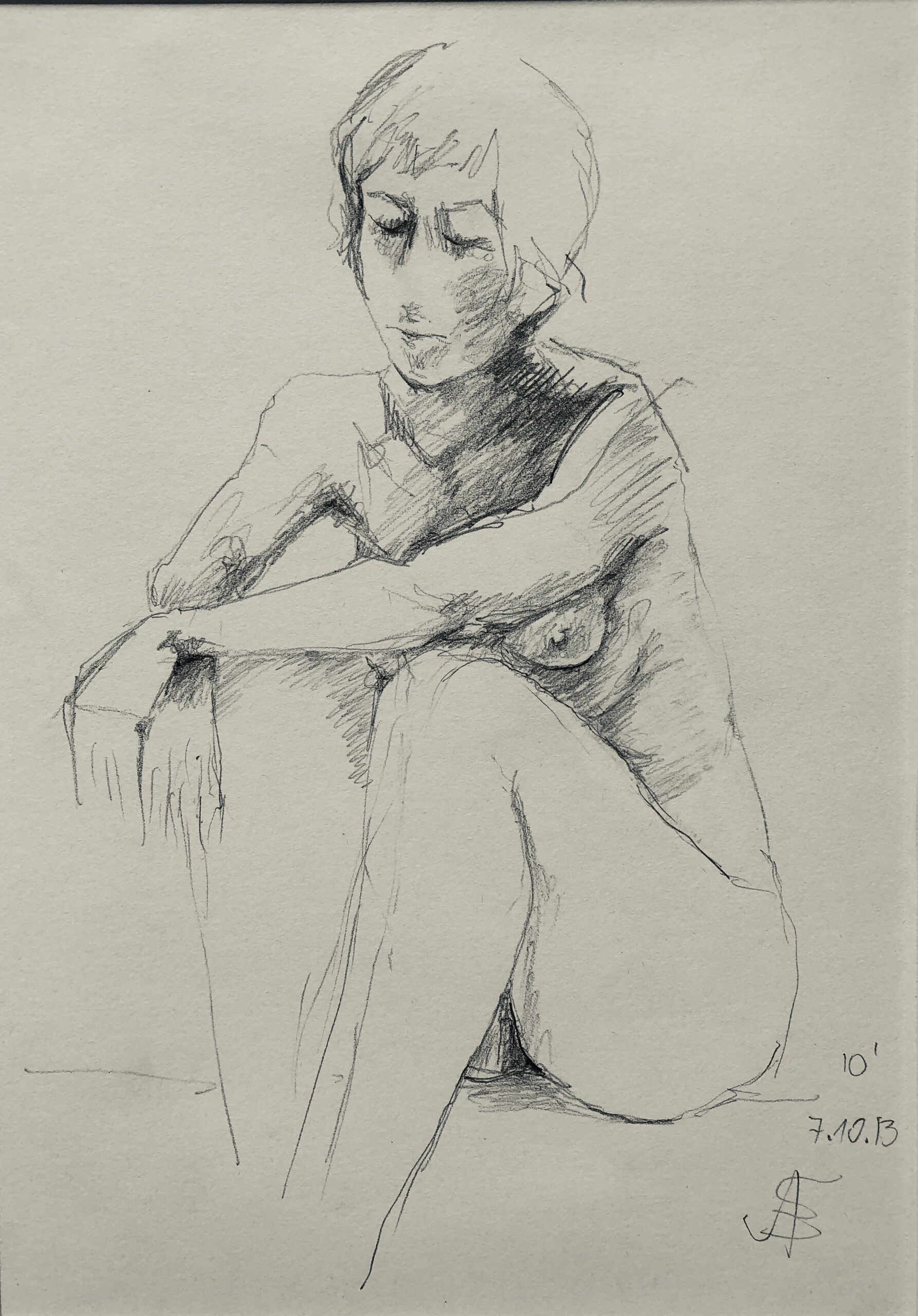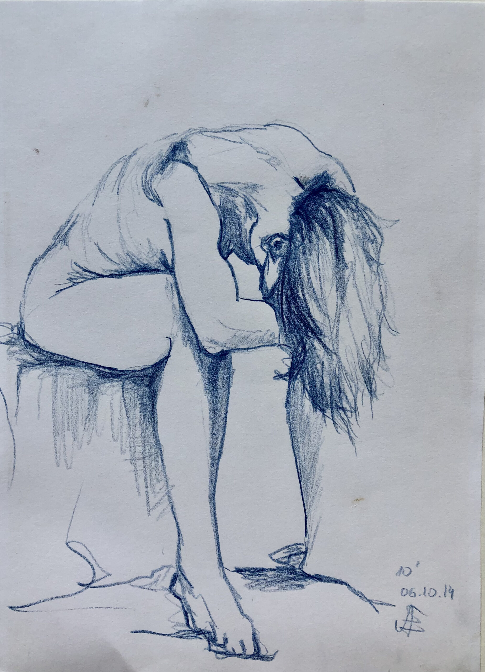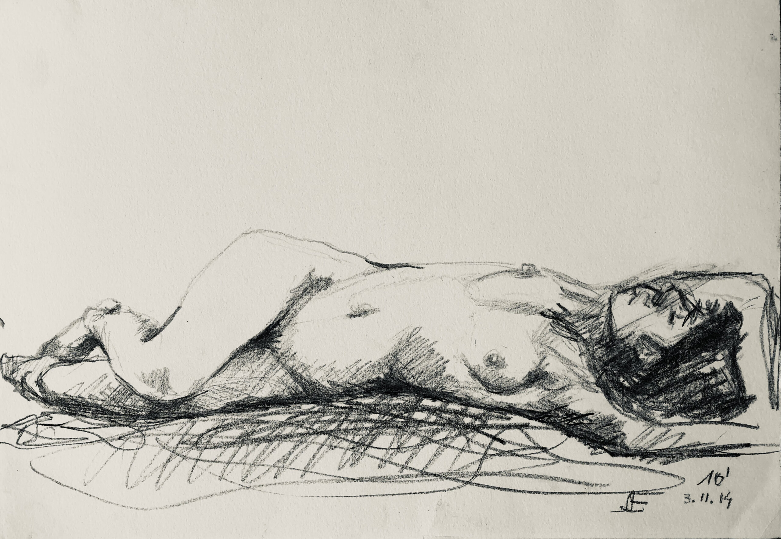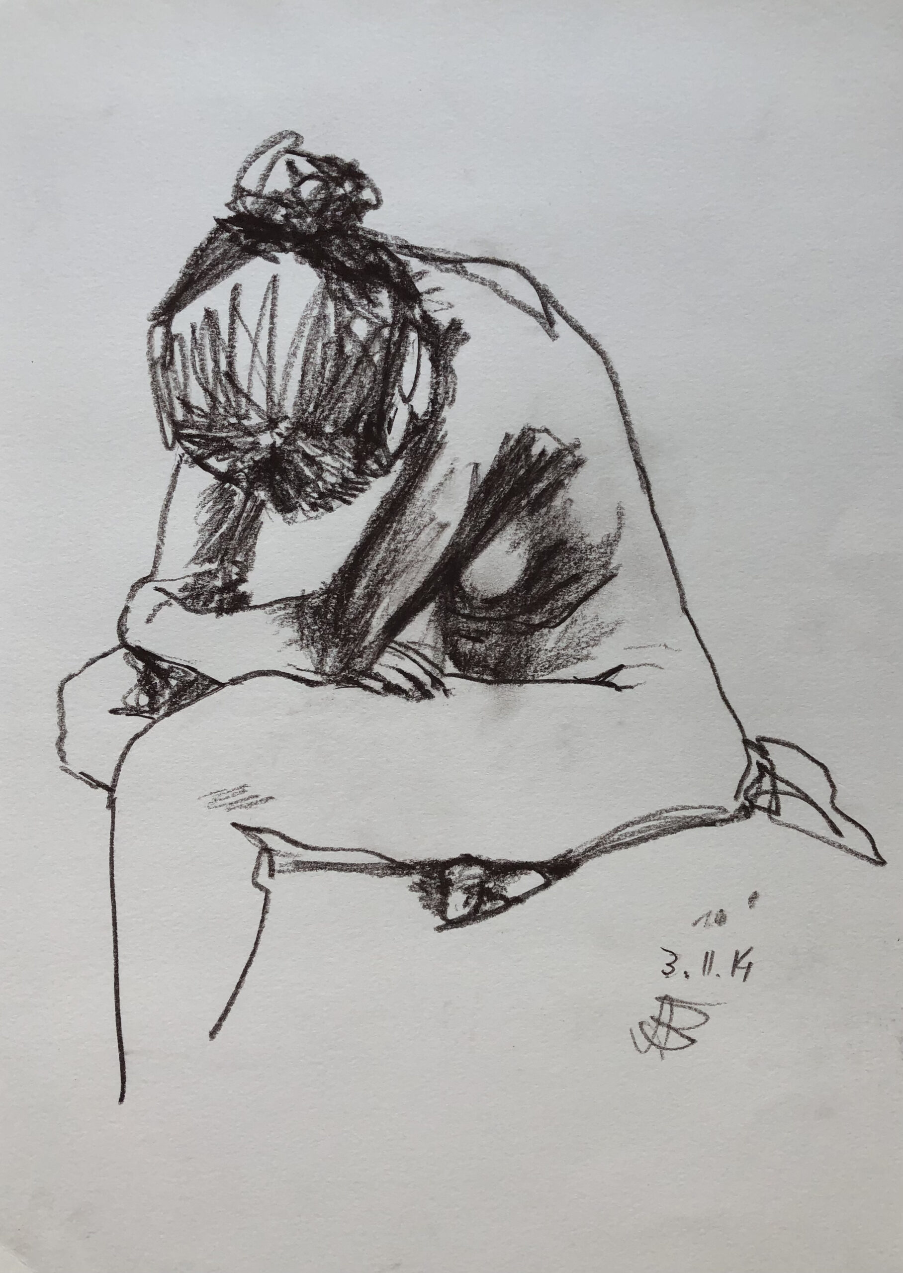 Oft sind es Schnellzeichnungen z.B. 10′ Minuten oder 15′ Minuten. Die Dauer des Zeichnens (10′) steht neben der Initialen.