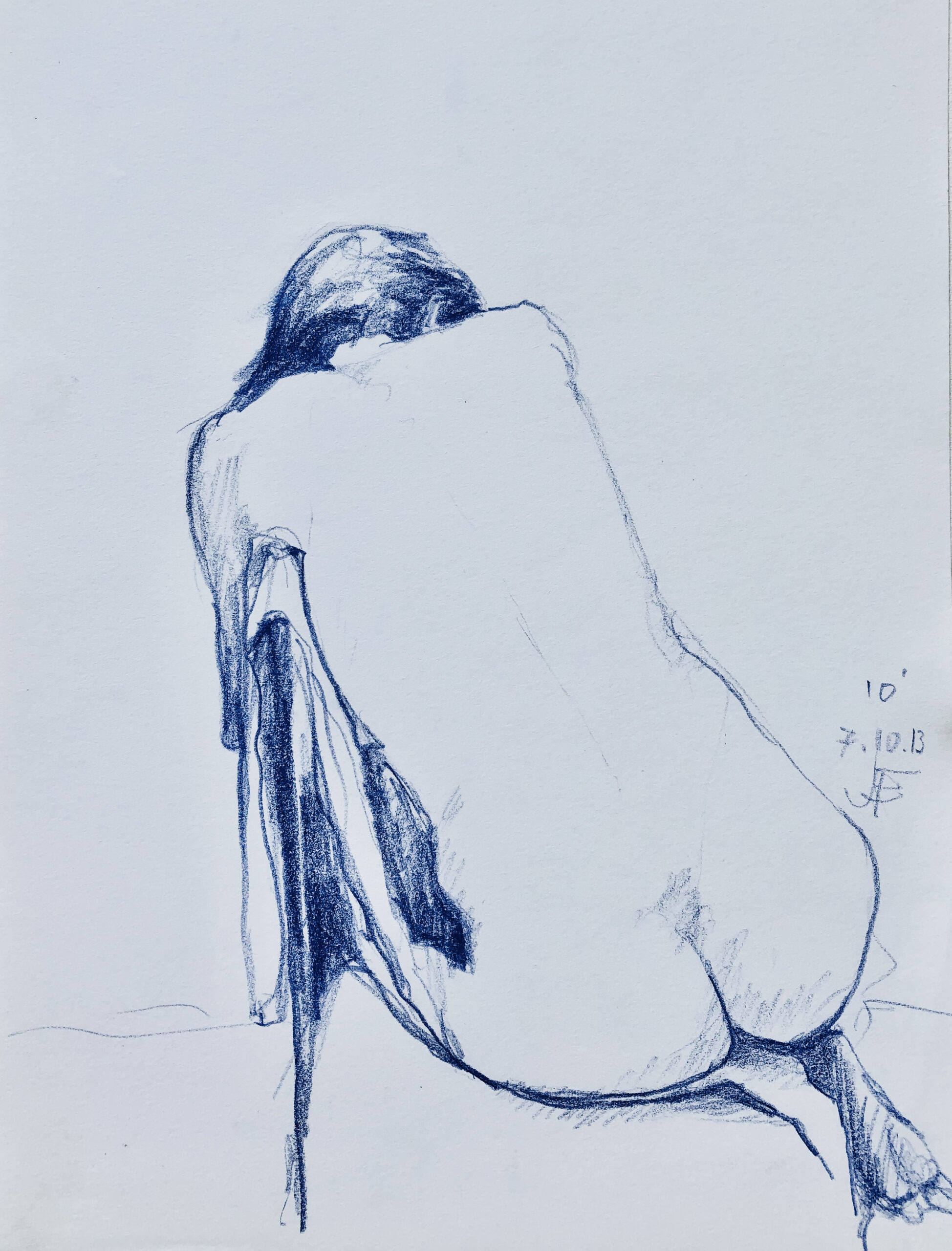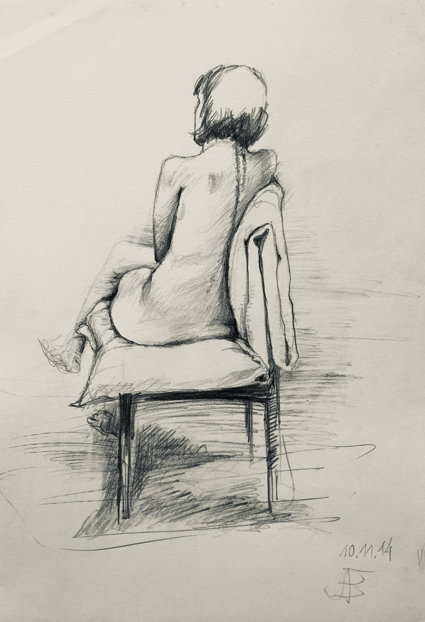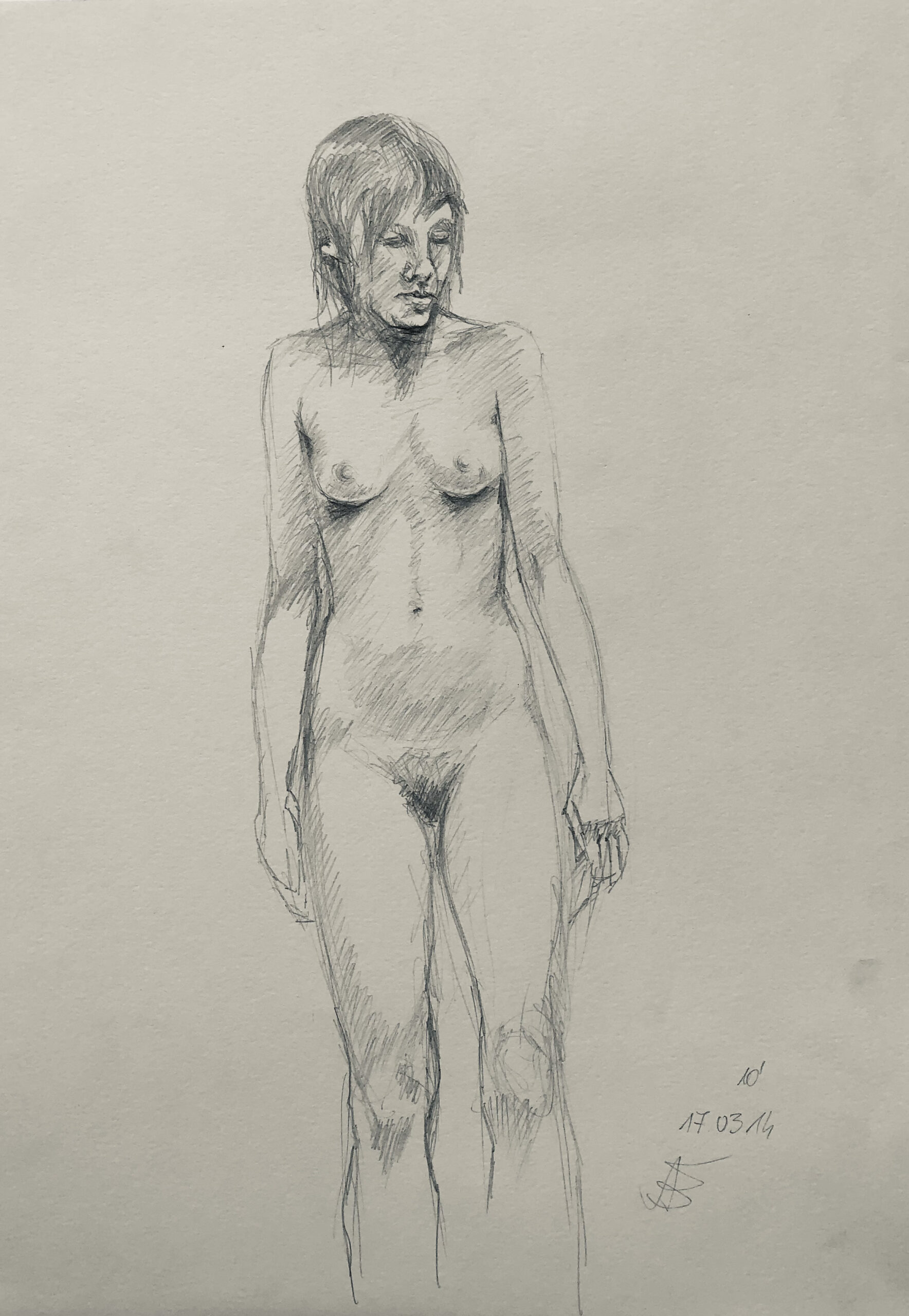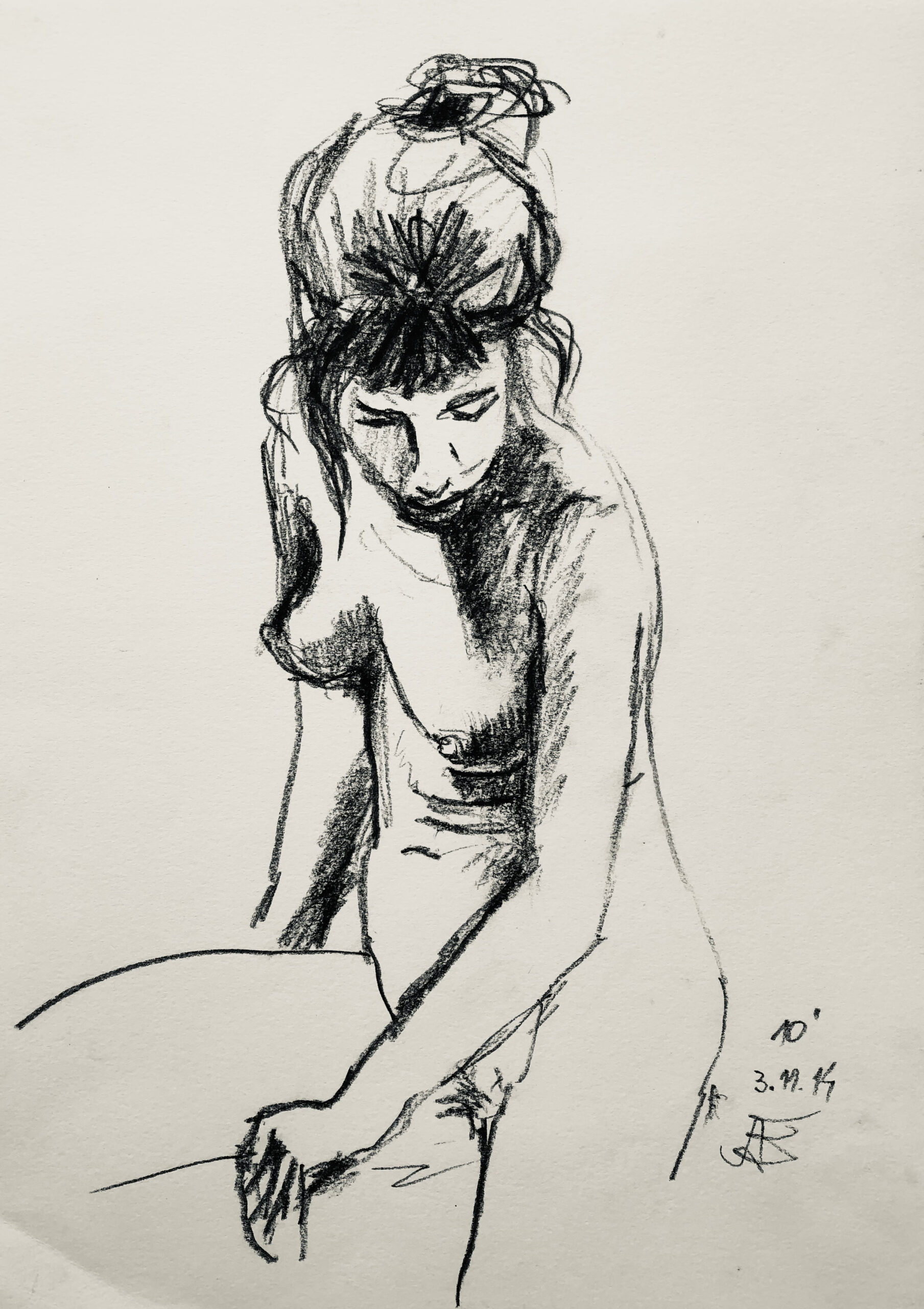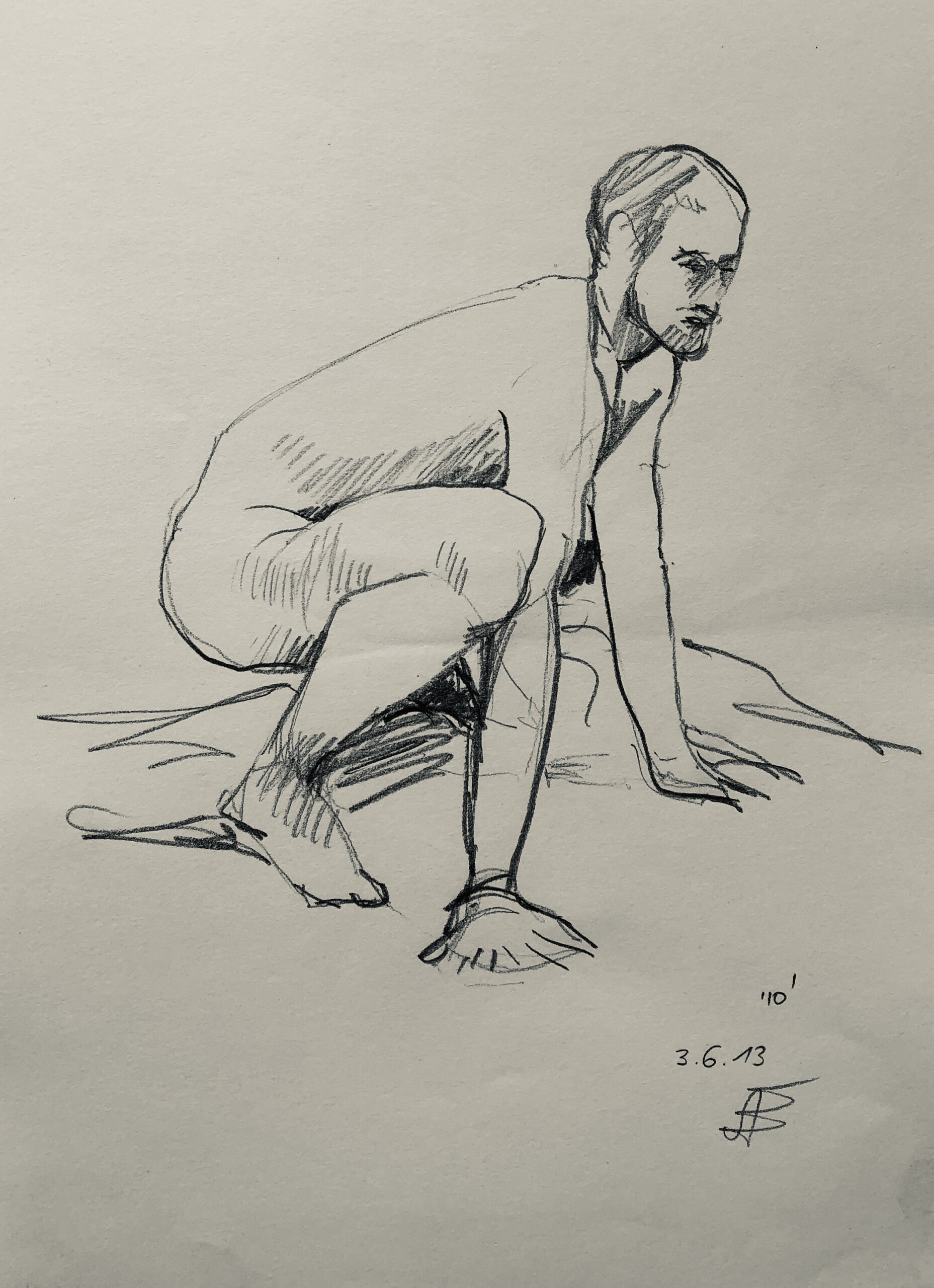 Oft sind es Schnellzeichnungen z.B. 10′ Minuten oder 15′ Minuten. Die Dauer des Zeichnens (10′) steht neben der Initialen.