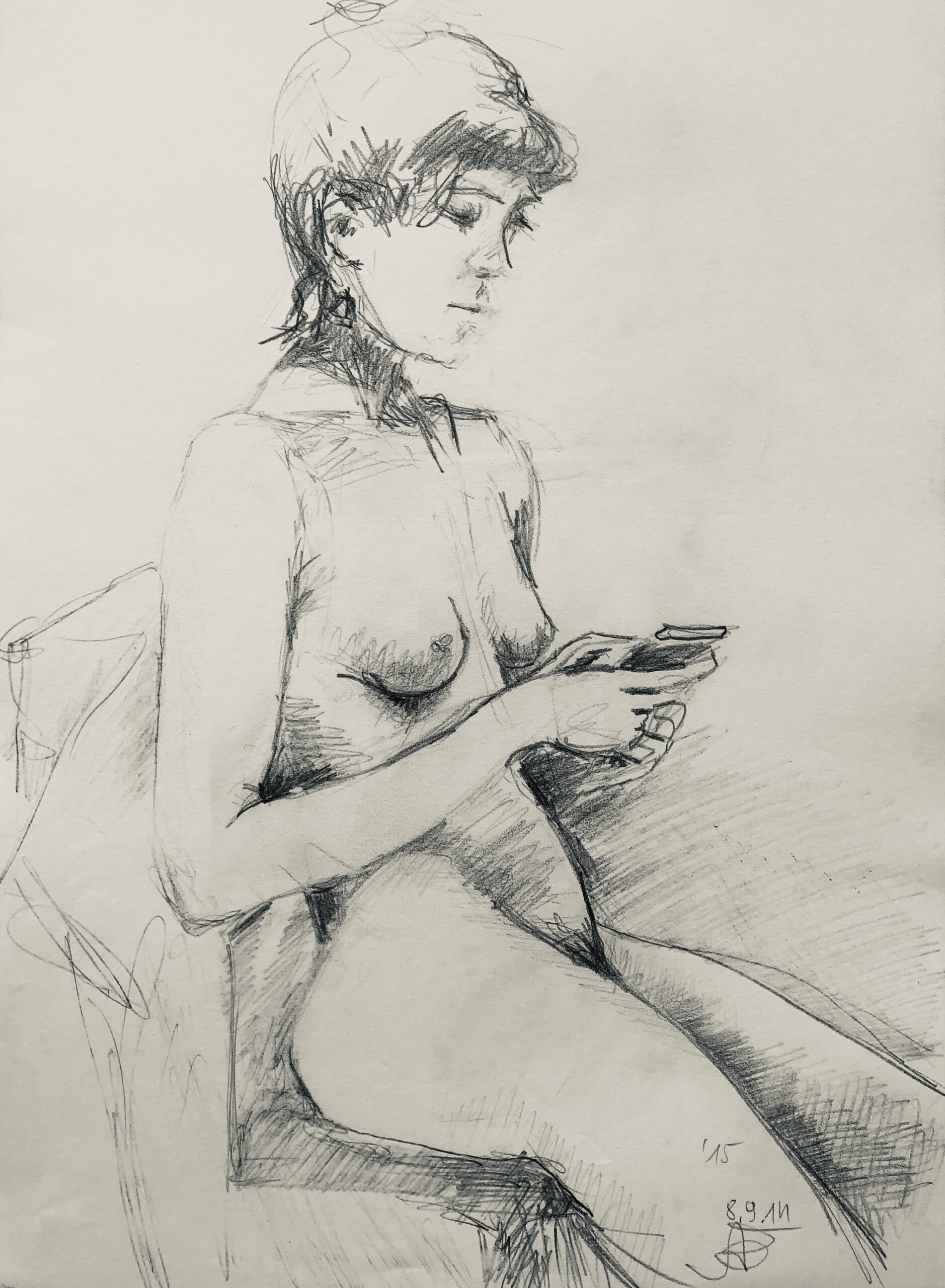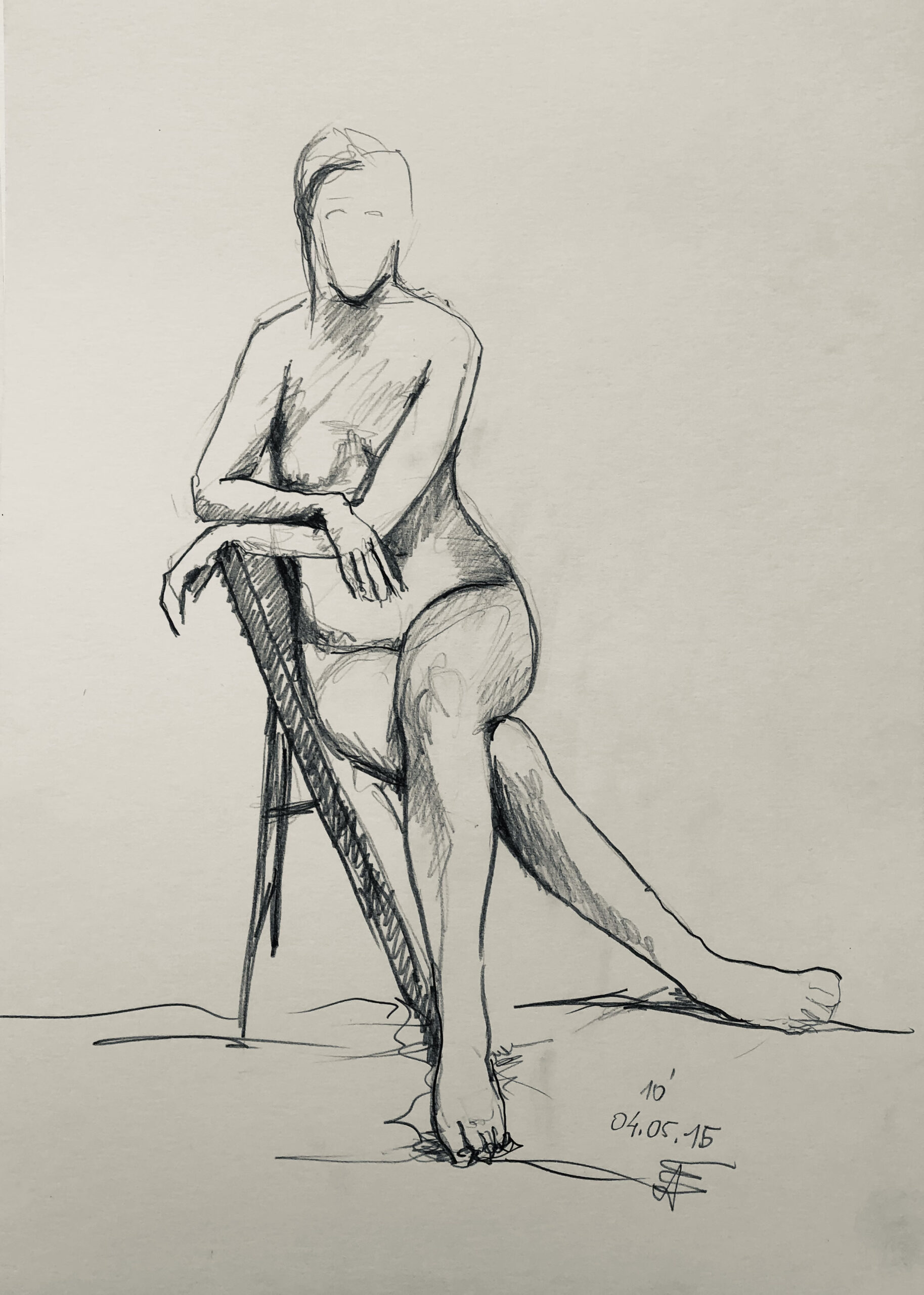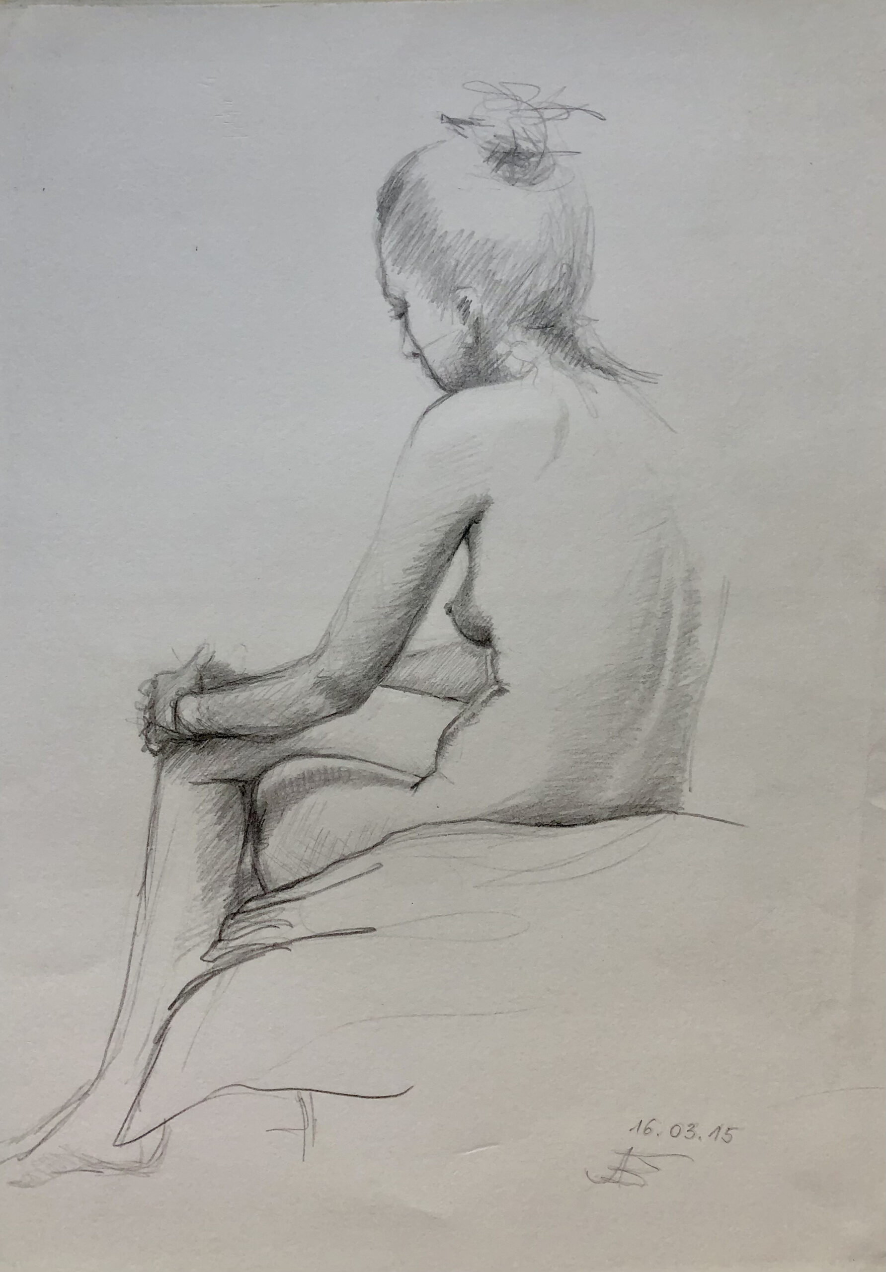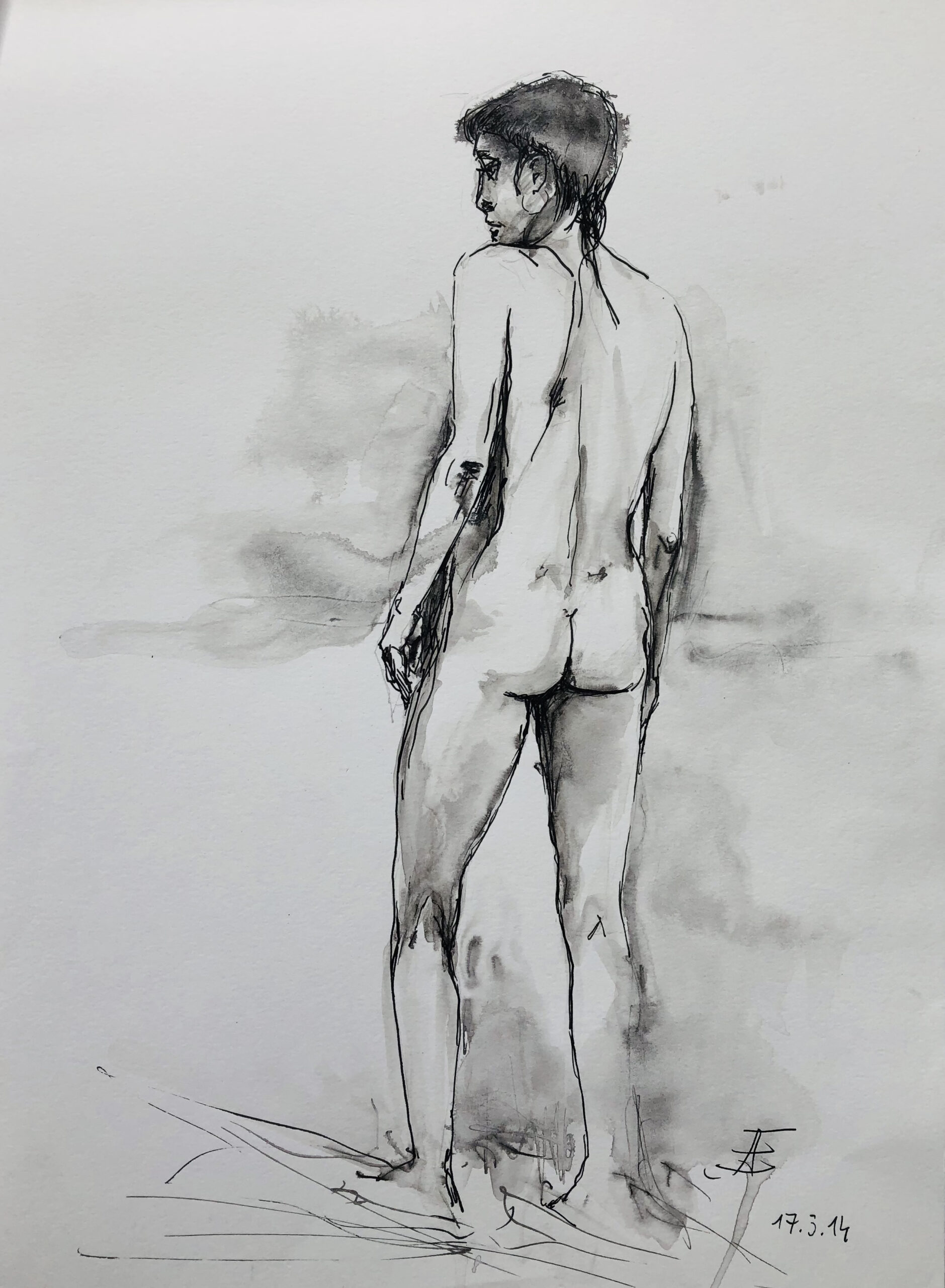 Oft sind es Schnellzeichnungen z.B. 10′ Minuten oder 15′ Minuten. Die Dauer des Zeichnens (10′) steht neben der Initialen.
