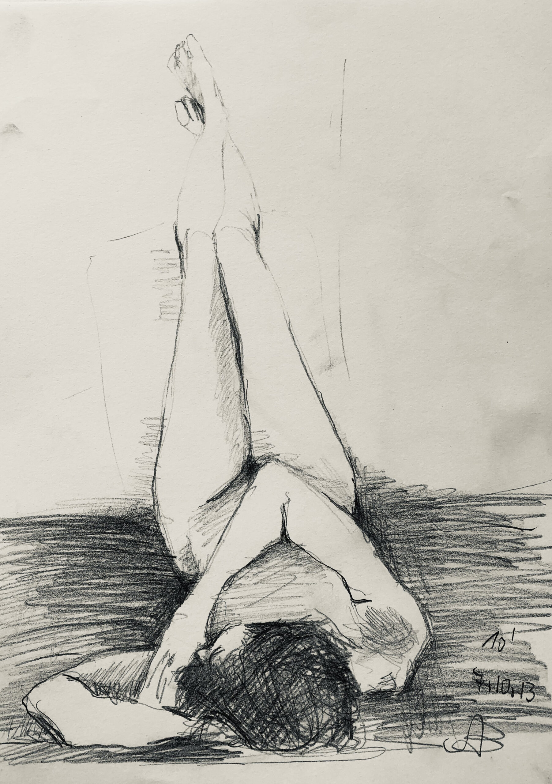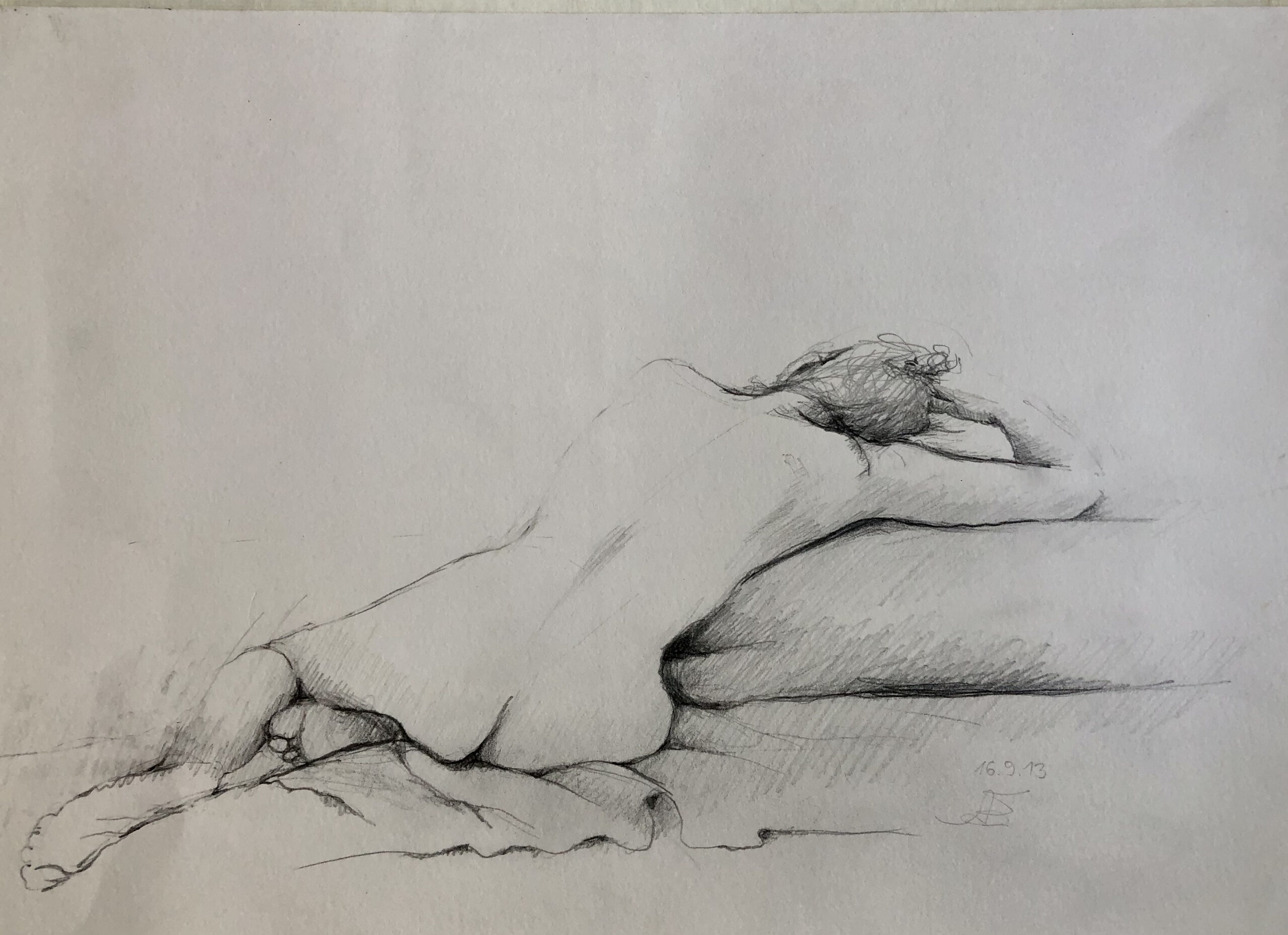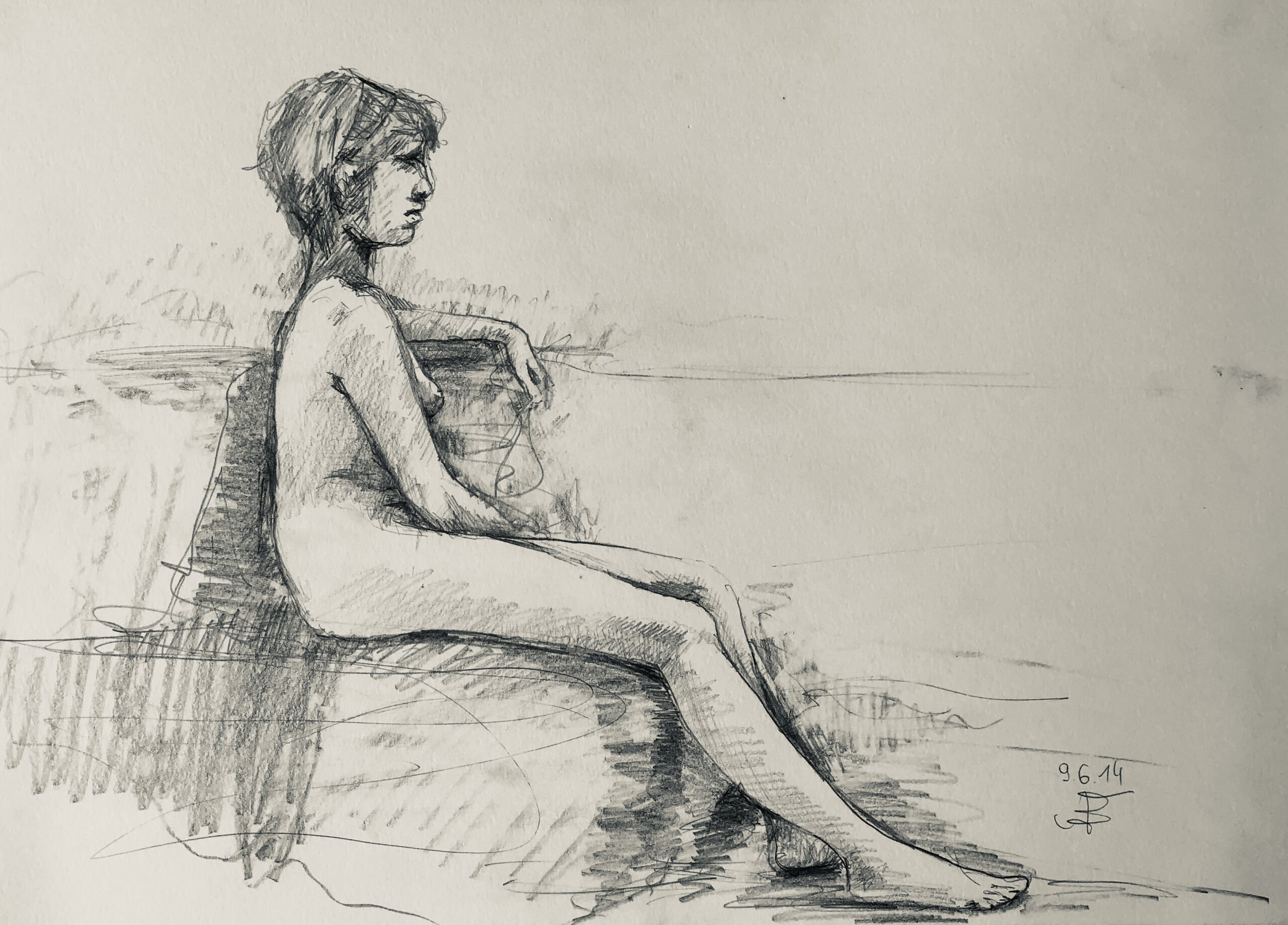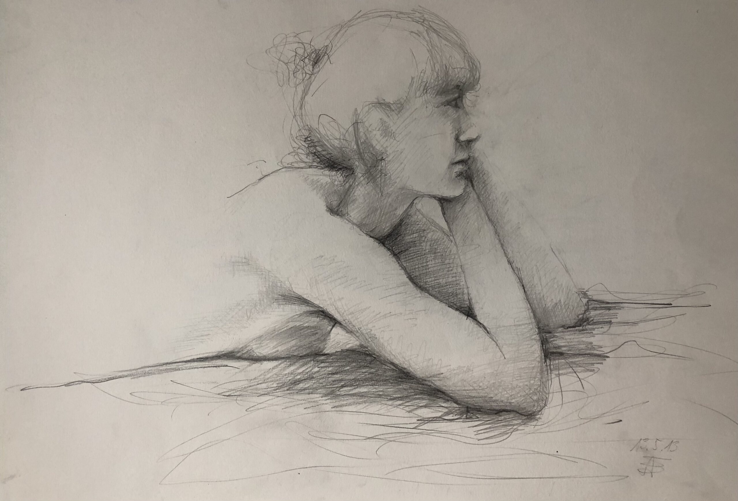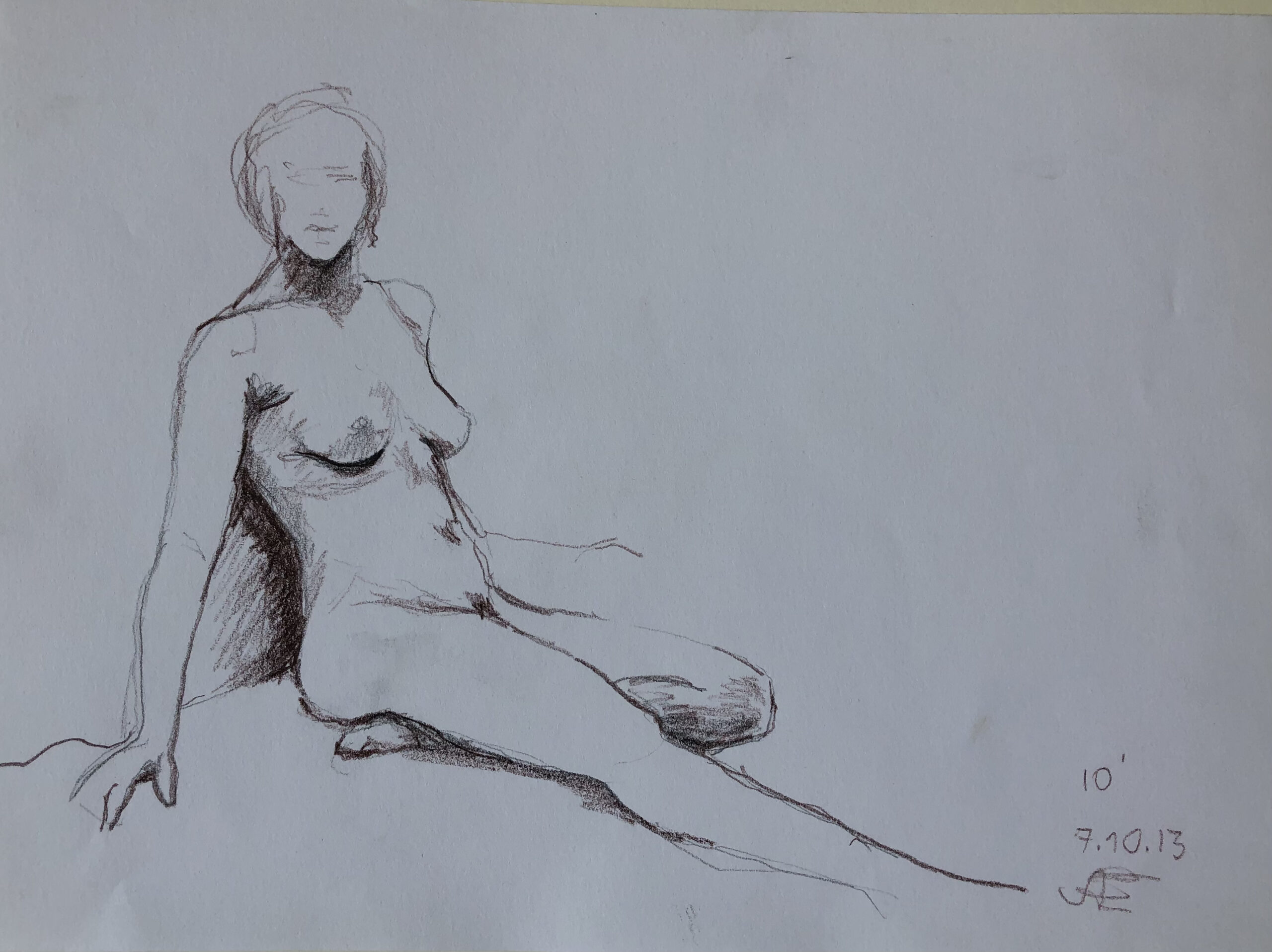 Oft sind es Schnellzeichnungen z.B. 10′ Minuten oder 15′ Minuten. Die Dauer des Zeichnens (10′) steht neben der Initialen.